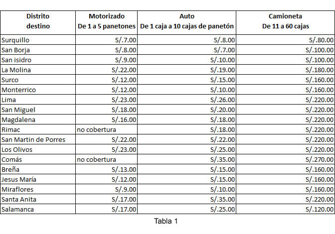Se entregaran pedidos de obsequios navideños entre 48 a 72 horas. Asimismo, se entregan pedidos de panetones de 7 a.m. a 00 horas. Otros envíos urgentes serán entregados según disponibilidad y coordinación de envío. Comuníquese con nosotros a cualquiera de nuestros teléfonos. Costo de envíos según distrito y volumen. Desde S/. 6. (Ver detalle en Tabla 1)